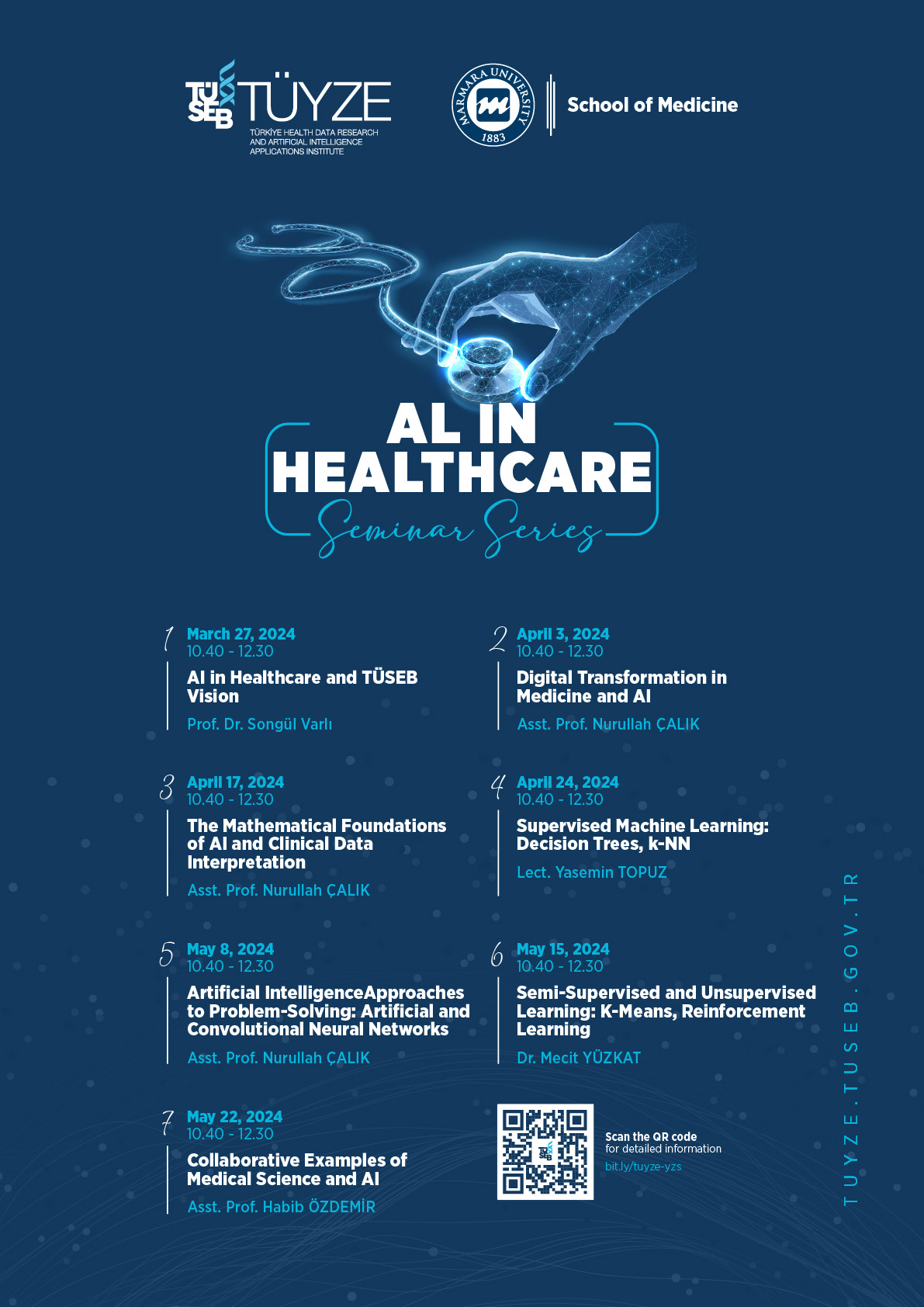 "The AI in Healthcare Seminar Series”, organized by the Türkiye Health Data Research and Artificial Intelligence Applications Institute (TÜYZE), with the goal of fostering expertise in data science and artificial intelligence in the field of digital health in our country, will commence on March 27, 2024 at the Conference Hall of Marmara University School of Medicine.