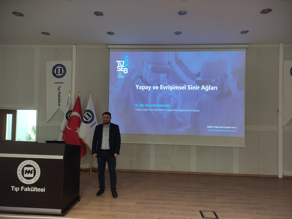 Within the scope of the AI in Healthcare Seminar Series, organized by the Türkiye Health Data Research and Artificial Intelligence Applications Institute (TÜYZE), the fifth talk named “Artificial Intelligence Approaches to Problem-Solving: Artificial and Convolutional Neural Networks” was presented by Asst. Prof. Nurullah ÇALIK. The talk took place at Marmara University School of Medicine on May 08, 2024.